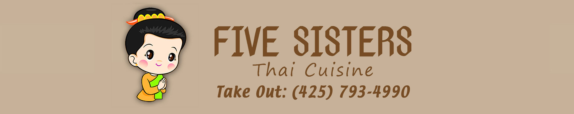 | We accept all major credit cards. No checks please. There is an 18% service charge added for parties of six or more. A maximum of four checks per table. Five Sisters Thai Cuisine Fairwood Shopping Center 14252 SE 176th St. Renton, WA 98058 Website: www.5sistersThai.com Take Out - To Go (425) 793-4990 • (425) 793-4940 Hours: Monday - Thursday 11:00 AM to 9:00 PM Friday -Saturday 11:00 AM to 9:30 PM Sunday 12:00 PM to 9:00 PM |